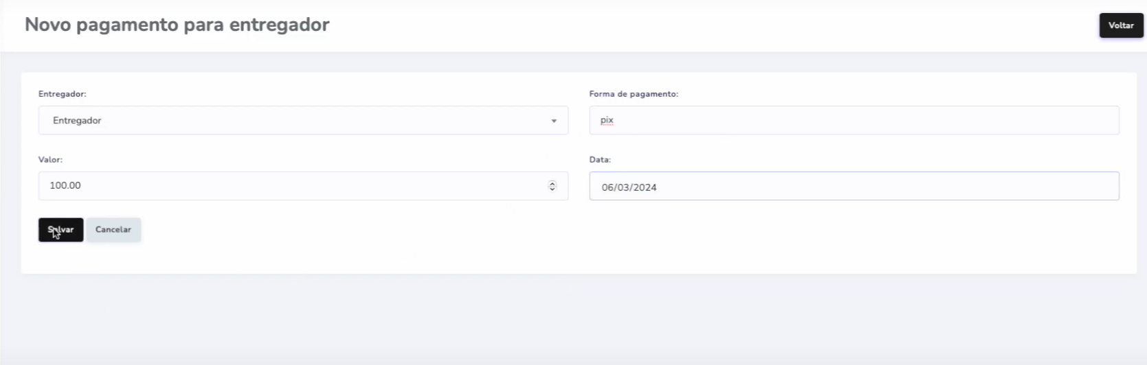 - Realizar um novo registro de pagamento, inserir dados como: ENTREGADOR, FORMA DE PAGAMENTO, VALOR, DATA.