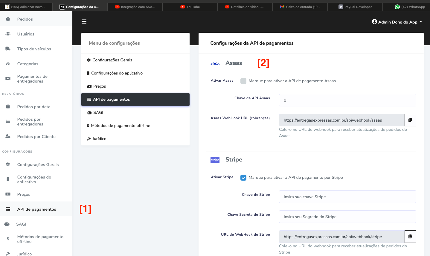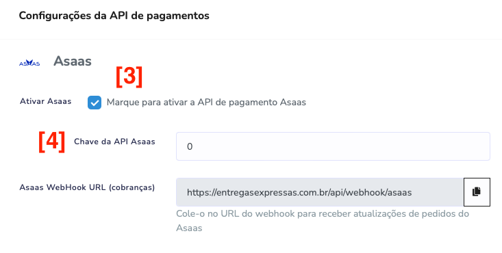 [4]. Cole a CHAVE DE API gerada em sua conta da ASAAS no campo CHAVE DA API ASAAS em sua plataforma de entregas.