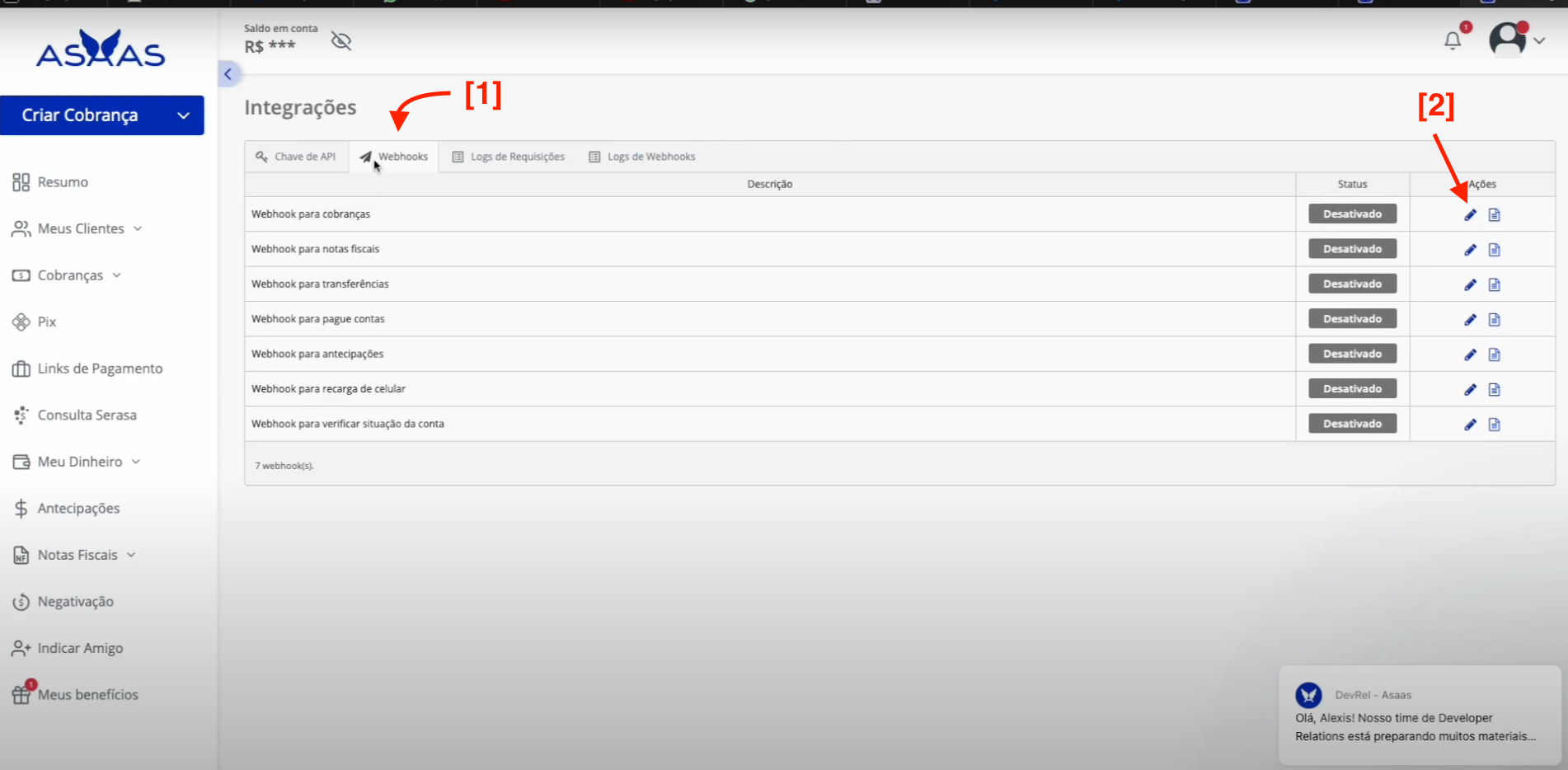 [2]. Clicar no LÁPIS na linha de WEBHOOK PARA COBRANÇAS.