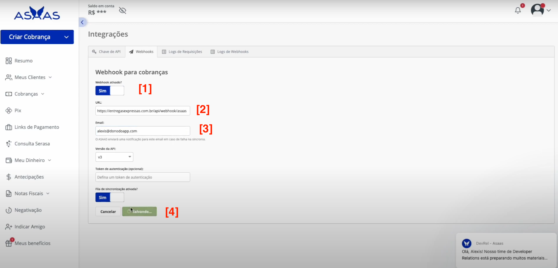 - Em ASAAS vamos preencher os campos de WEBHOOK PARA COBRANÇA.