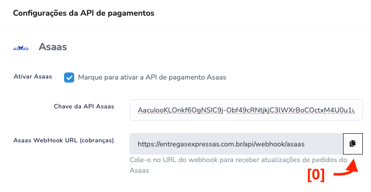 [0]. Copiar o LINK de ASAAS WEBHOOK URL(Cobranças).