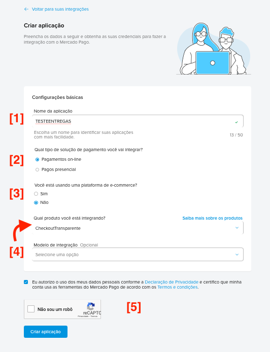 [5]. Você apenas irá autorizar os TERMOS E CONDIÇÕES e clicar em NÃO SOU ROBÔ(e confirmar com uma verificação simples, caso necessário) e CRIAR APLICAÇÃO.