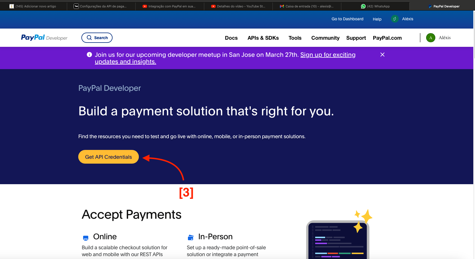 - No site do PAYPAL DEVELOPER com sua conta já criada e LOGADA vamos clicar em GET API CREDENTIALS!