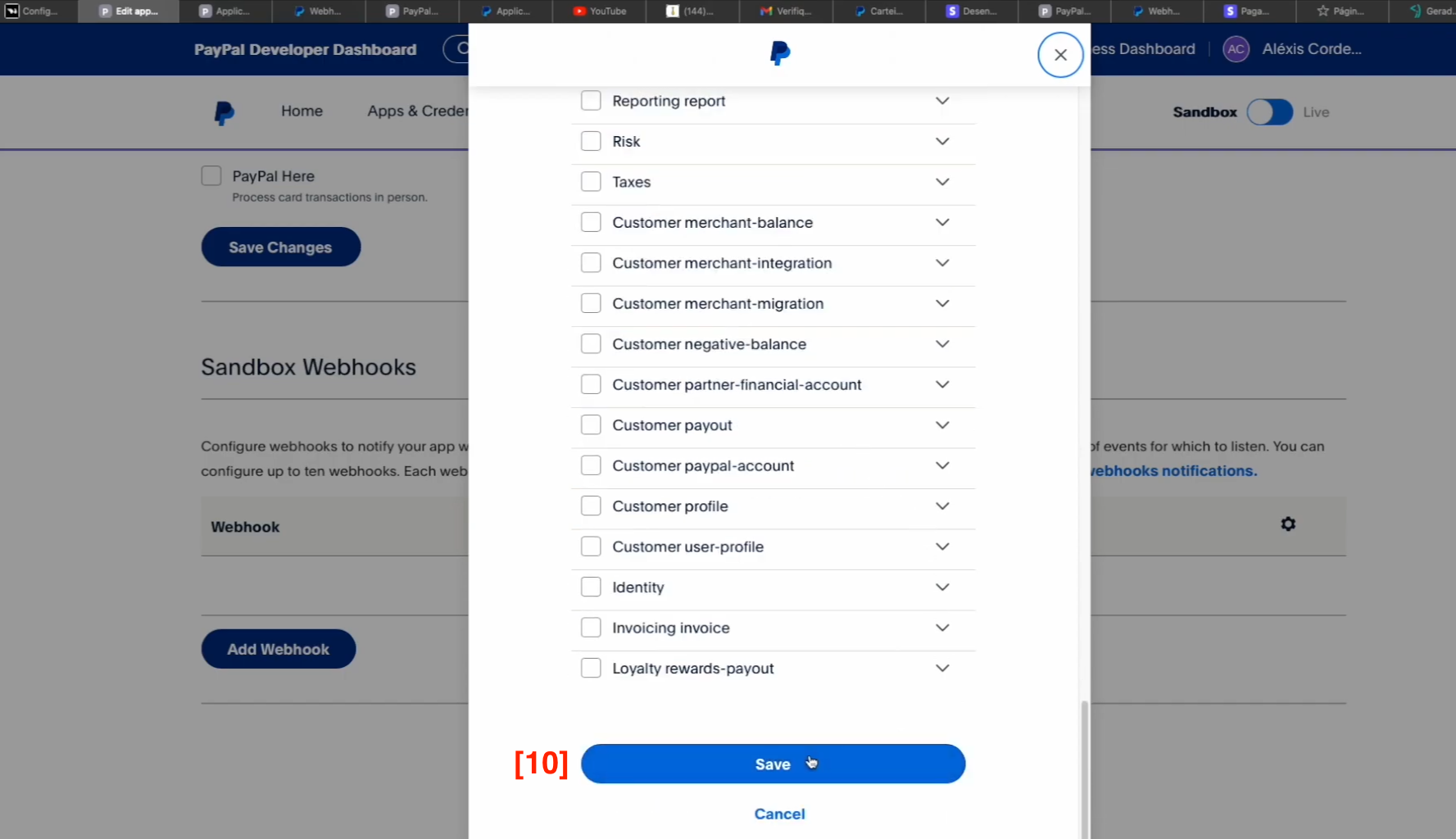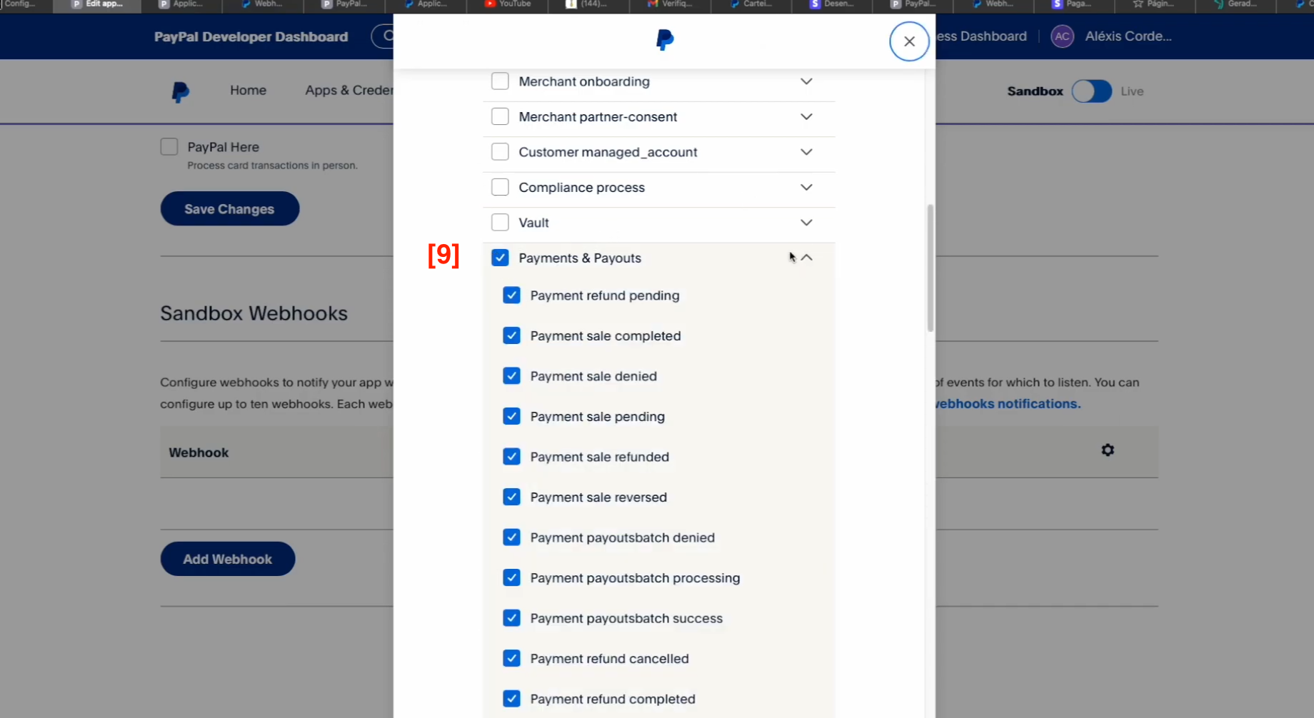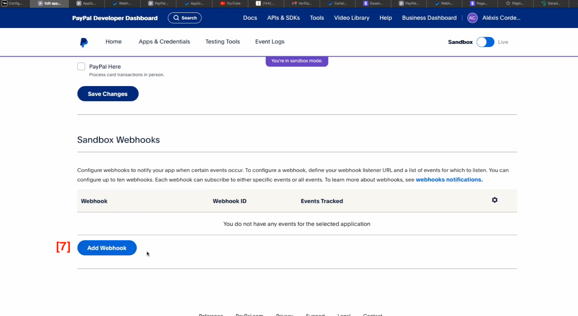[7]. Clicar em ADD WEBHOOK que está mais em baixo no PayPal.