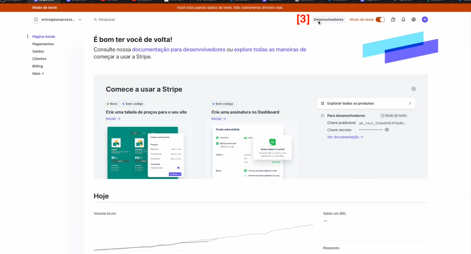 [3]. Com sua conta da STIPE já criada e verificada, vamos na parte SUPERIOR em DESENVOLVEDORES.