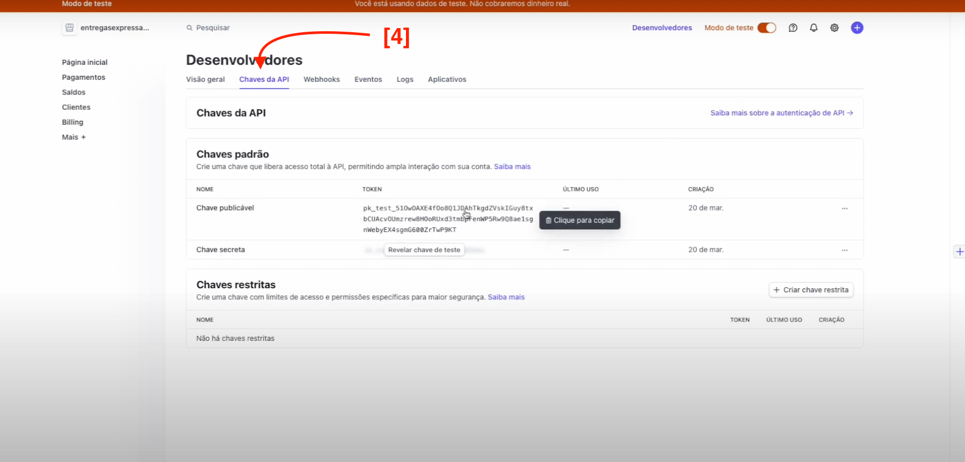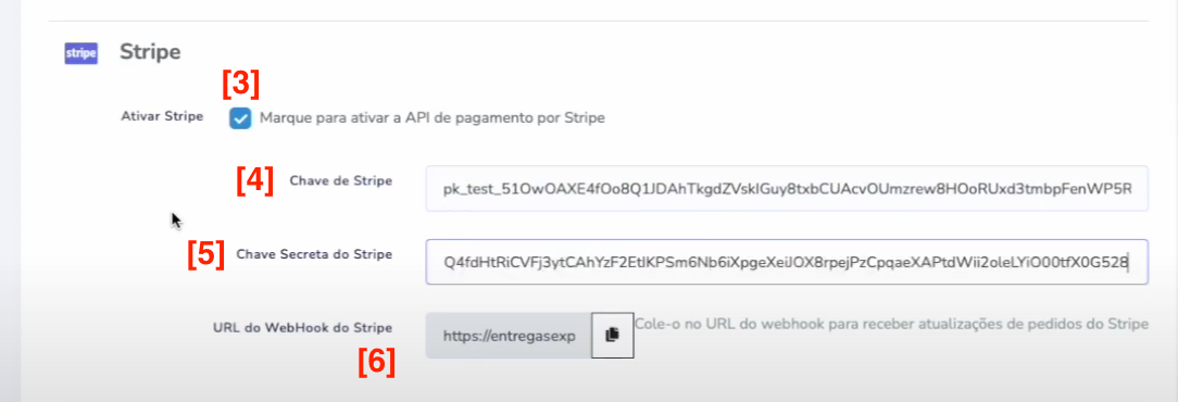 [4]. CHAVE DE STRIPE, campo onde irá ser COLADA a chave COPIADA, CHAVE PUBLICÁVEL[ITEM[1]].