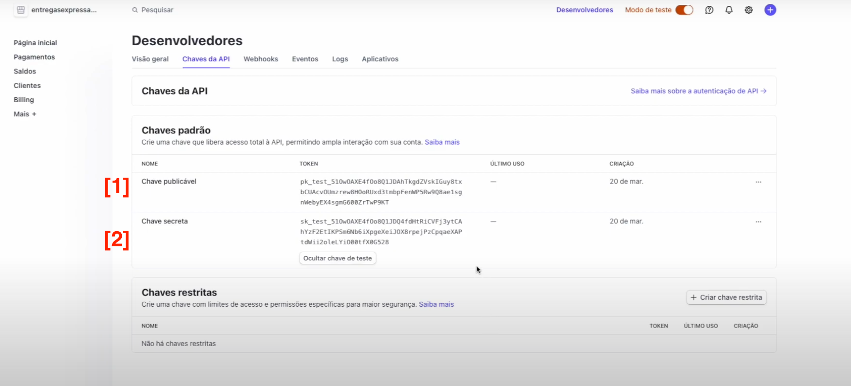 [2]. CHAVE SECRETA, iremos COPIAR essa chave e COLAR no campo CHAVE SECRETA DA STRIPE[ITEM[5]].