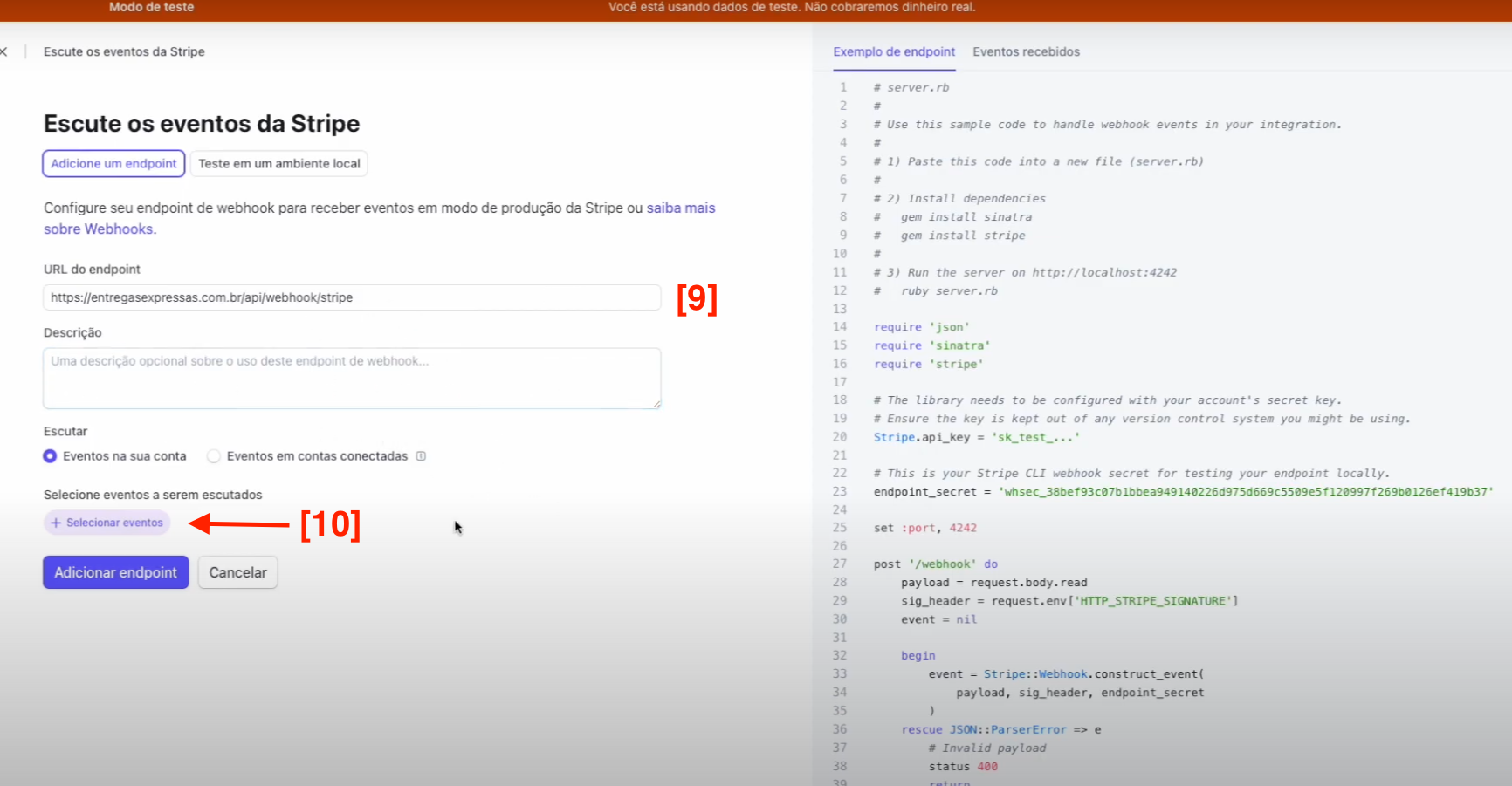 [9]. Em URL DO ENDPOINT iremos COLAR a chave COPIADA em URL DO WEBHOOK[ITEM[6]].