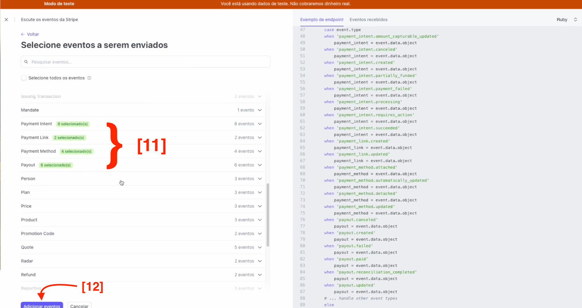 [11]. Selecionar TODAS as opções de PAYMENT INTENT, PAYMENT LINK, PAYMENT METHOD e PAYOUT.